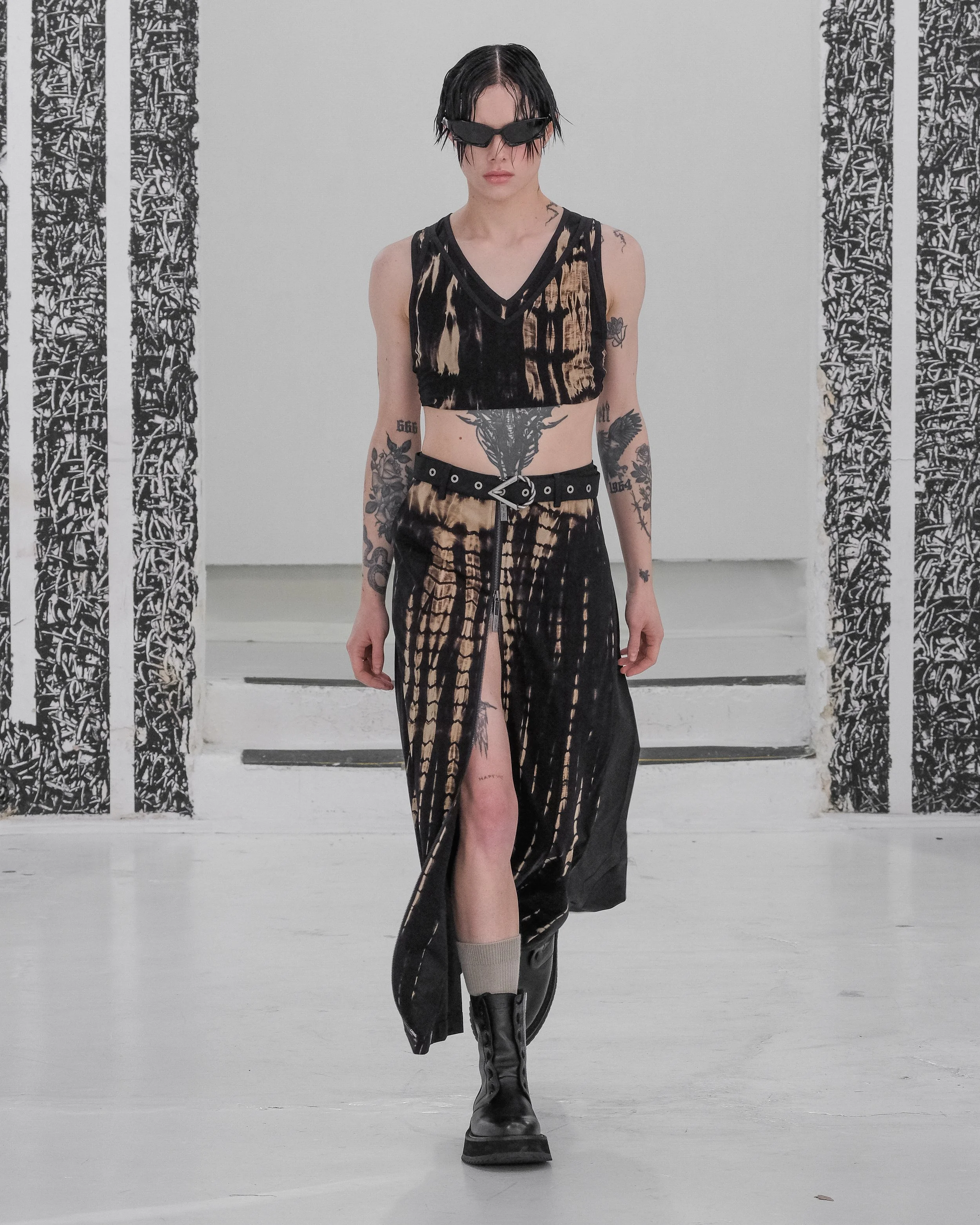 For SS24 Jarel Zhang was inspired from the episode, "The Very Pulse of the Machine" of the animated series, "Love, Death, Robots". Upon my arrival at the venue, mistakenly through the side door might I had, I had the chance to preview all of the sketches that were on a board. Remnants of the previous presentations that have been running earlier that day. About 15 minutes later and after a wonderfully refreshing glass of champagne, the models were called to assemble backstage and everybody took their places. The artists in front of their easels with fresh paper and charcoal in hand. The attendees lined up all around the room. There was a feeling of anticipation. Models came through one by one, making a full circle around the room and took their final positions in the middle of the room on cloth draped blocks. Each piece of this fashion puzzle struck a pose until the final collection was revealed in its entirety with the last model in place. The artists began to draw, illustrating their own interpretations of the collection that was presented.